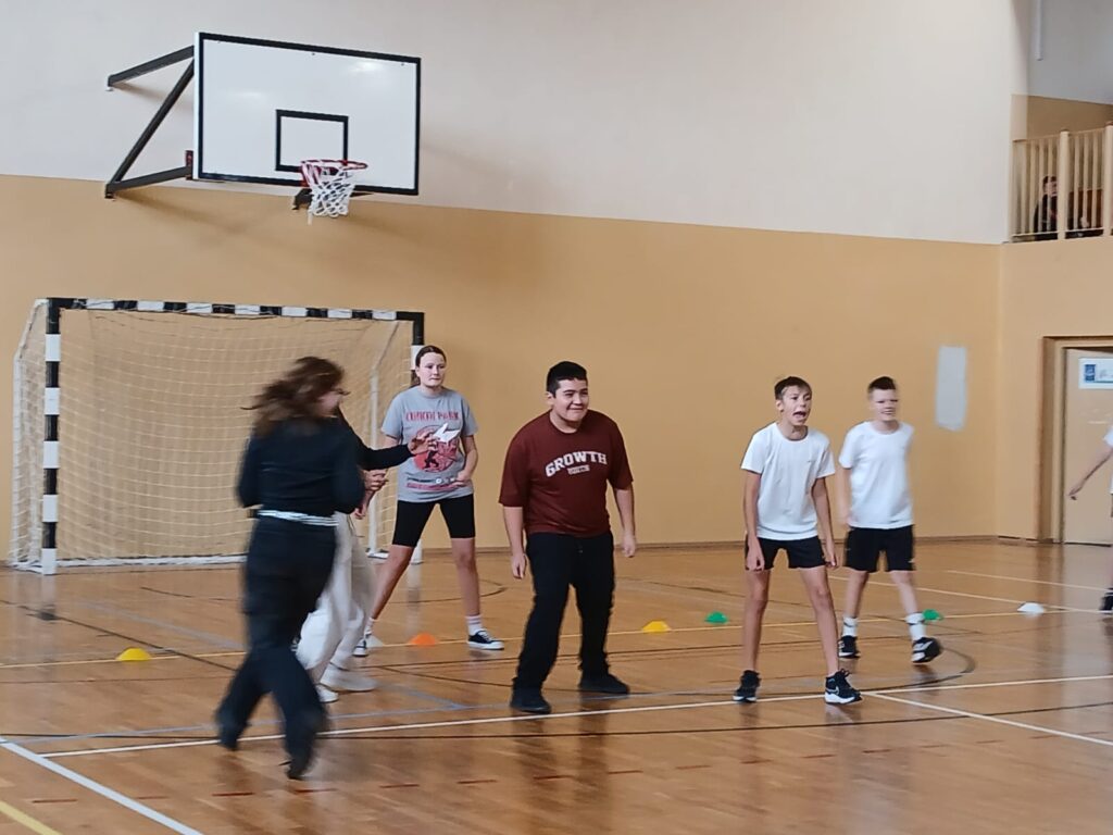 Następnie na dużej sali gimnastycznej zorganizowano gry i zabawy sędziowane przez panią Dorotę Szczyszczaj, które pozwoliły na swobodną interakcję i przełamanie barier. Po aktywności fizycznej nadszedł czas na zwiedzanie szkoły oraz słodki poczęstunek. Wizyta przyjaciół z Chile w naszej szkole zakończyła się wspólnym zdjęciem oraz wymianą upominków.