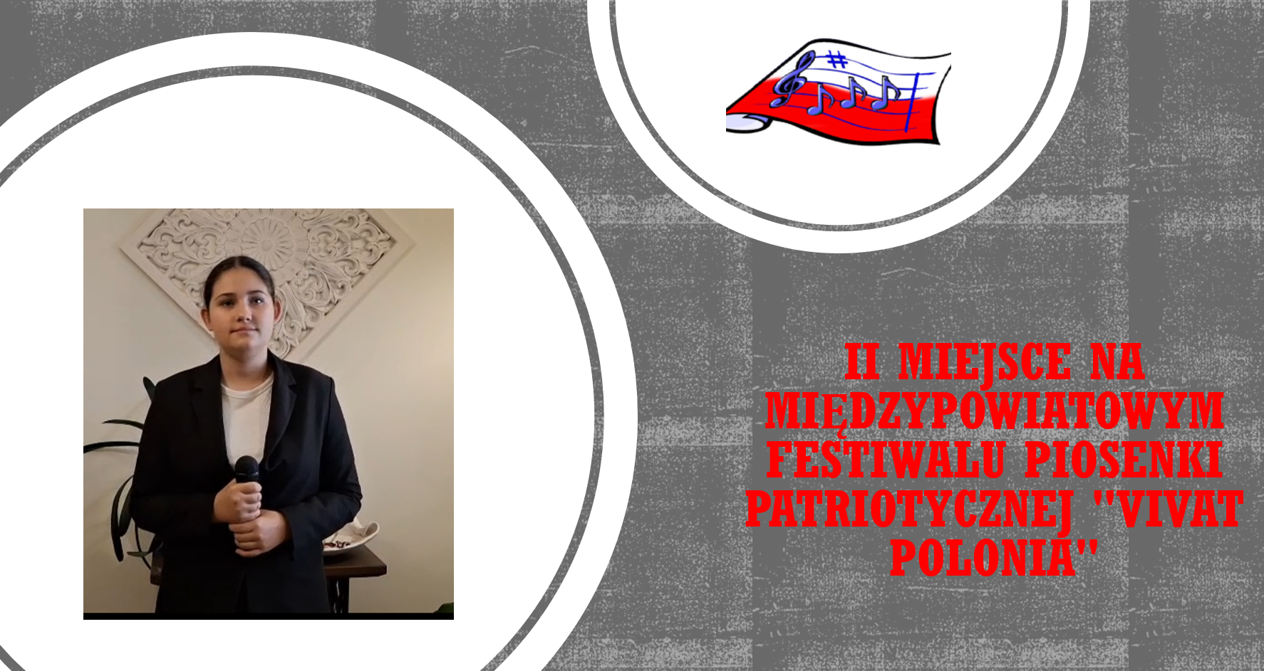 Nasza uczennica klasy ósmej Alicja Rządzińska zdobyła II miejsce w XIV Międzypowiatowym Festiwalu Piosenki Patriotycznej „Vivat Polonia”. Alicja wykonała utwór Janusza Radka „Ja to mam szczęście…”. Nasza uczennica jest bardzo utalentowana wokalnie i odnosi wiele sukcesów. Serdecznie gratulujemy Alicji i życzymy dalszych sukcesów.