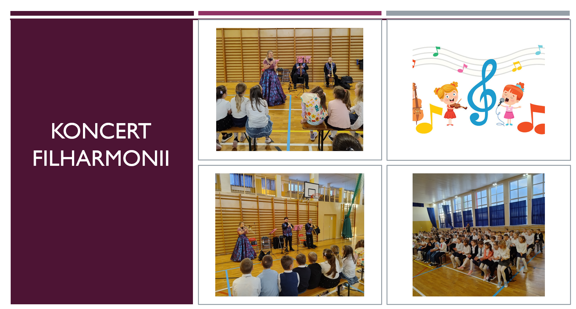 W piątek 28 listopada odbył się drugi w tym roku szkolnym koncert filharmonii. Uczniowie klas 1–3 oraz 4-6 obejrzeli koncert pt. „Bajki polskie – O królewnie zaklętej w żabę”. Podczas wydarzenia dzieci miały okazję słuchać utworów wykonywanych na puzonach i saksofonie sopranowym.