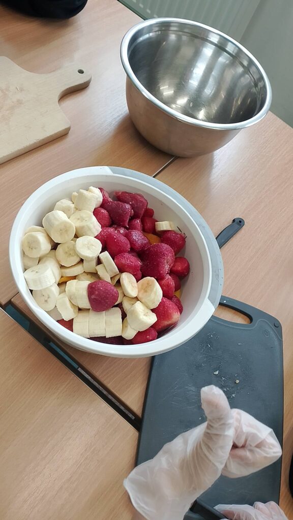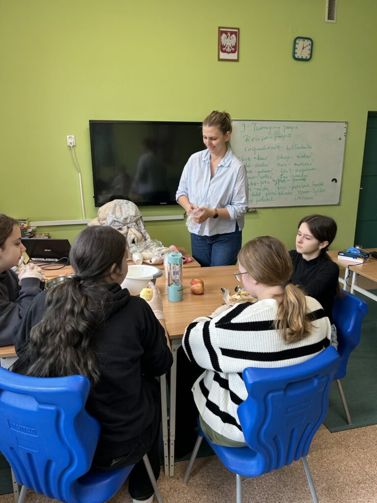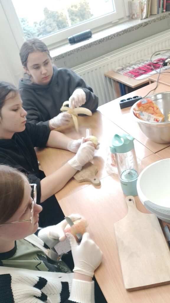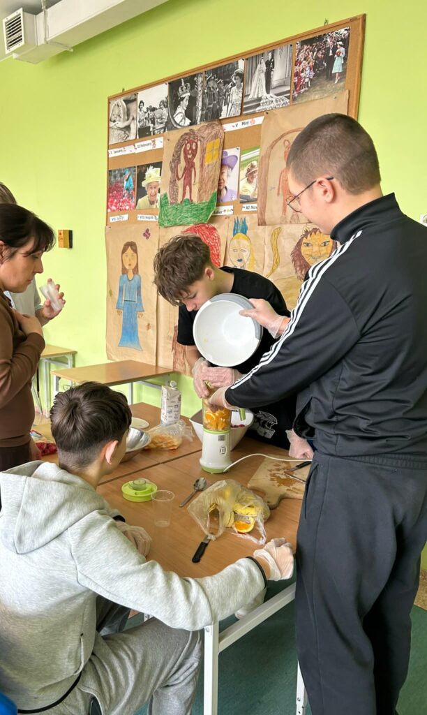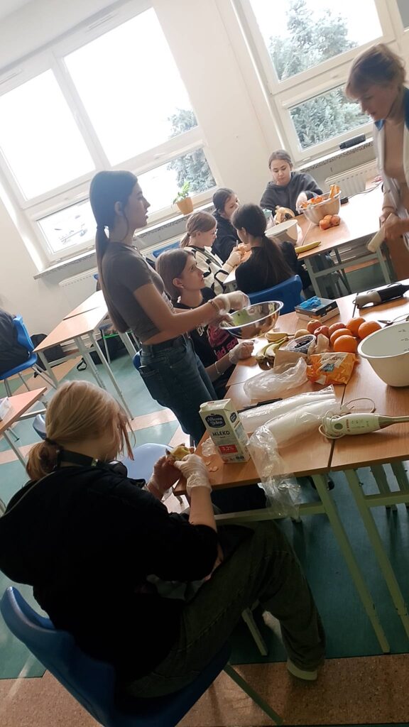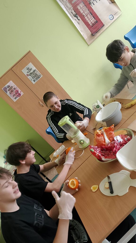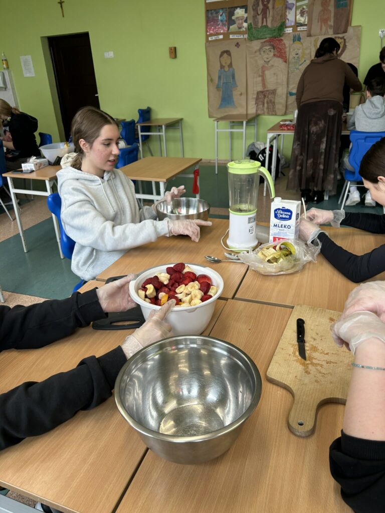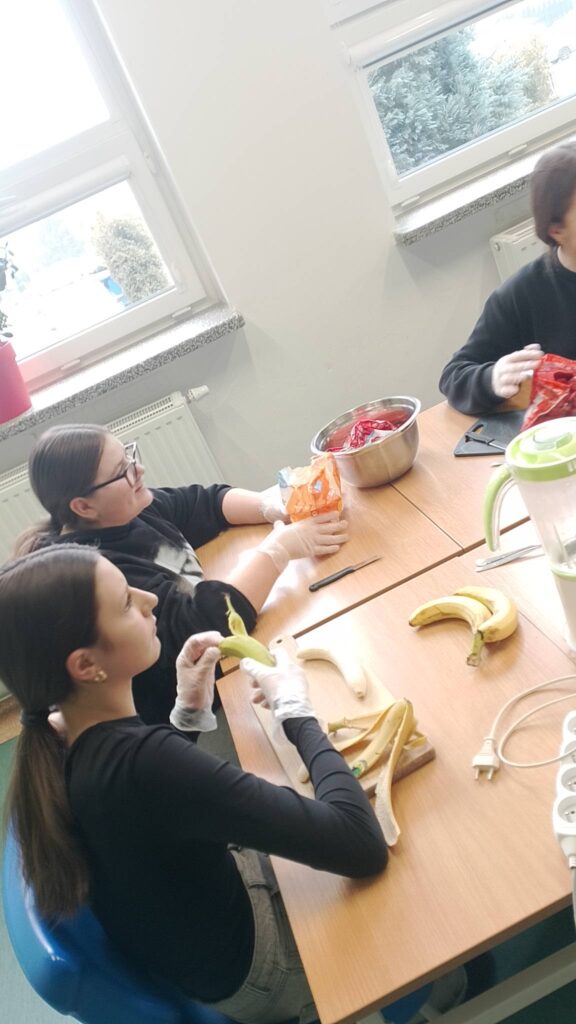 W poniedziałek 16 lutego uczniowie klasy 7a wzięli udział w spotkaniu z panią dietetyk Dorotą Mickiewicz-Górą, podczas którego uczniowie przygotowali przepyszne i zdrowe koktajle owocowe. Zajęcia rozpoczęły się krótką pogadanką na temat roli owoców w codziennej diecie i tego, dlaczego warto wybierać naturalne składniki zamiast gotowych, słodzonych napojów. Pani dietetyk w przystępny sposób opowiedziała dzieciom o witaminach, błonniku i zdrowych nawykach żywieniowych. Następnie przyszedł czas na część praktyczną – uczniowie z ogromnym zaangażowaniem kroiły owoce, komponowały własne koktajlowe mieszanki i poznawały nowe smaki. Wśród składników znalazły się m.in. banany, truskawki, mango, borówki, mleko. Nie zabrakło radości, śmiechu i oczywiście… pysznej degustacji! Zajęcia z panią dietetyk nie tylko rozbudziły ciekawość dzieci do zdrowego odżywiania, ale także pokazały, że robienie zdrowych przekąsek może być świetną zabawą. Warsztaty zostały zrealizowane jako element edukacji prozdrowotnej.