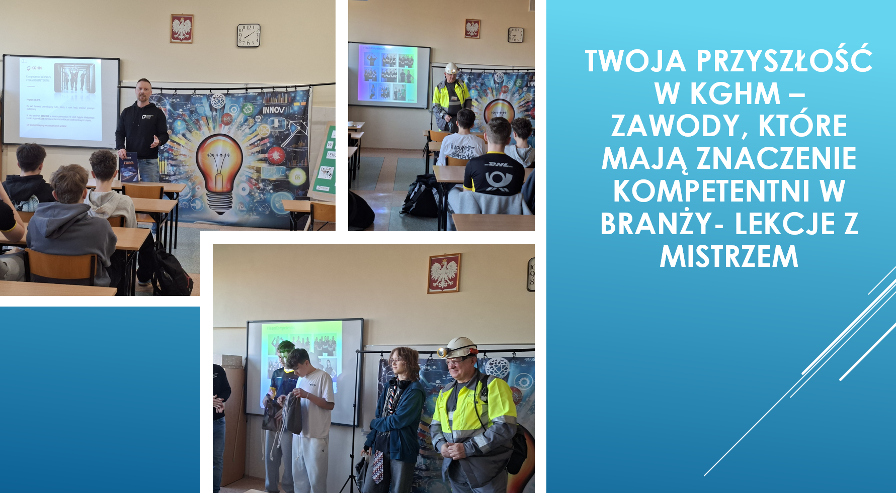 Podczas spotkania zaproszeni goście opowiedzieli ścieżce zawodowej, codziennych obowiązkach oraz kompetencjach potrzebnych w pracy w KGHM. Uczniowie dowiedzieli się również, jakie możliwości rozwoju zawodowego oferuje firma oraz jakie kwalifikacje są szczególnie cenione na rynku pracy.