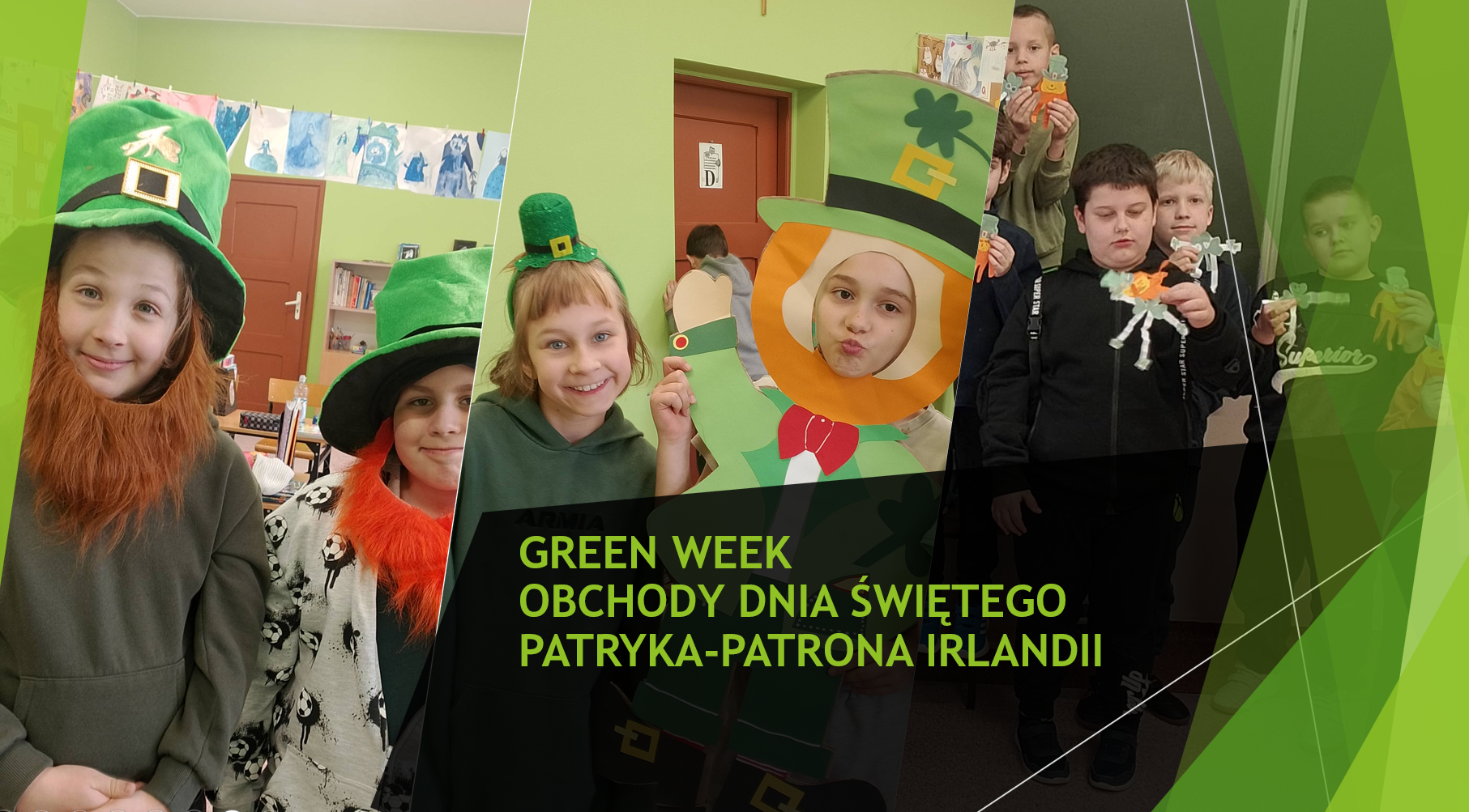 Natomiast w dniach 16–20 marca Green Week, podczas lekcji języka angielskiego, uczniowie dowiedzieli się, kim dla mieszkańców Irlandii jest Święty Patryk poznali legendy związane z tą postacią. W atmosferę uroczystości wprowadziły nas lekcje tematyczne, uczniowie obejrzeli prezentację na temat tego święta. Klasy pierwsze wykonały opaski zielone symbolizujące kapelusz Leprechauna. Natomiast uczniowie klas drugich i trzecich zrobili z kolorowych kartek symbole święta Irlandii: skrzata Leprechauna i Shamrock Man.