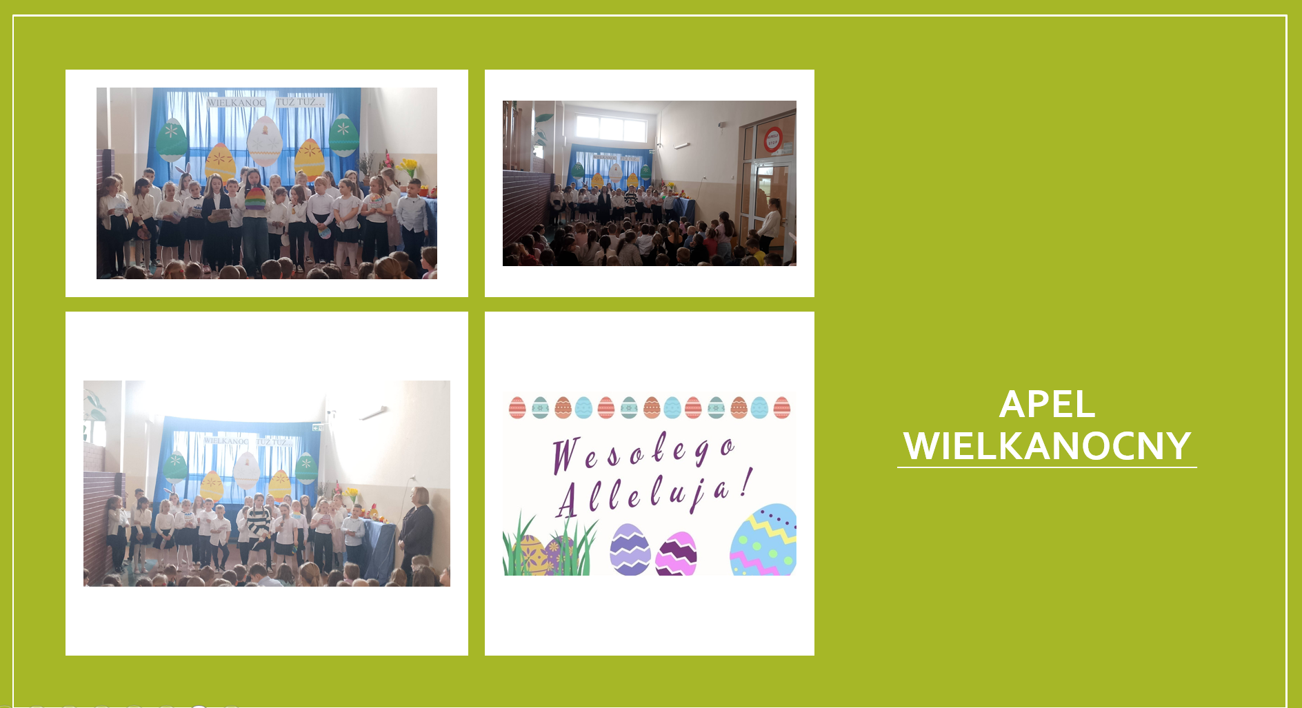 W środę 1 kwietnia w naszej szkole odbył się apel z okazji Świąt Wielkanocnych. Uczniowie klas pierwszych, drugiej i czwartej przygotowali program artystyczny, który wprowadził wszystkich w świąteczny nastrój. Podczas apelu dzieci przedstawiły różne zwyczaje wielkanocne i przybliżyły symbolikę świąt. Program był wypełniony pięknymi piosenkami. Dzieci występowały na tle wielkanocnych dekoracji, które wprowadziły wszystkich w świąteczny klimat. Celem apelu było przybliżenie i uwrażliwienie uczniów na sens przeżywanych świąt. Na zakończenie uroczystości pani Dyrektor złożyła życzenia zdrowych i rodzinnych świąt nauczycielom, uczniom i ich rodzicom.
